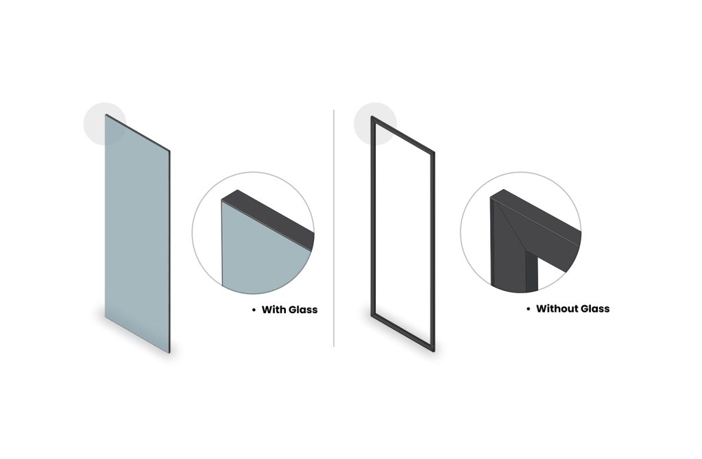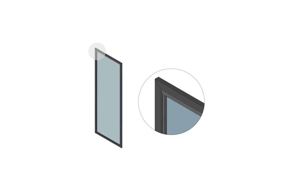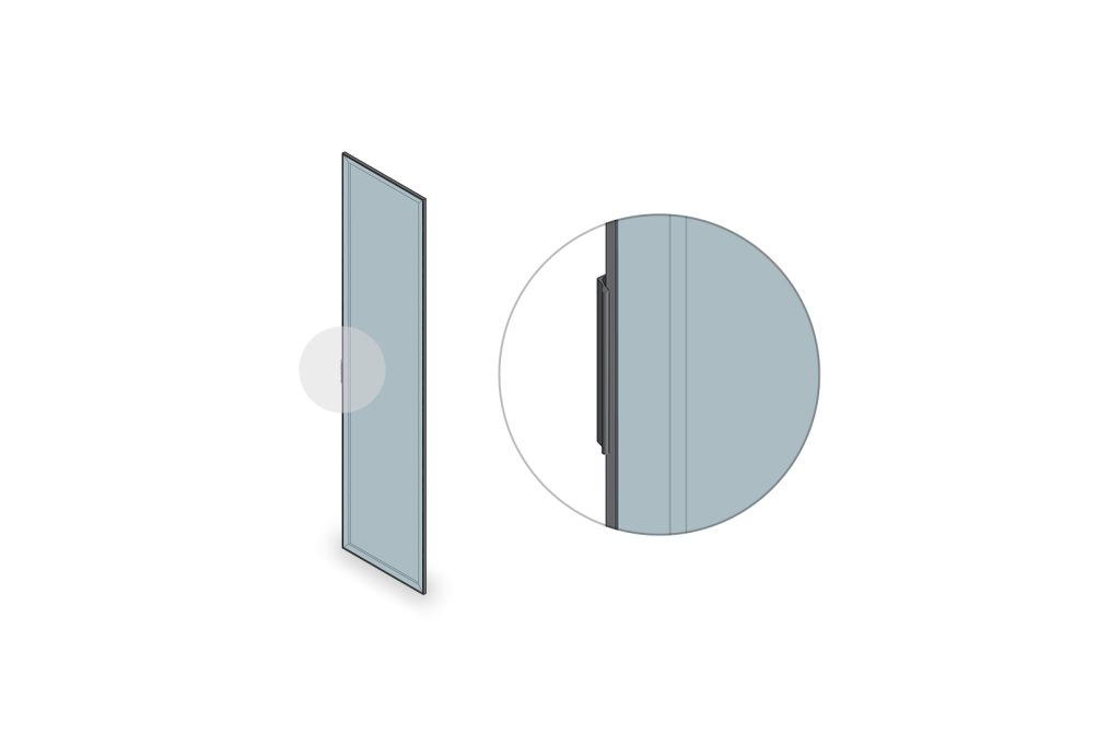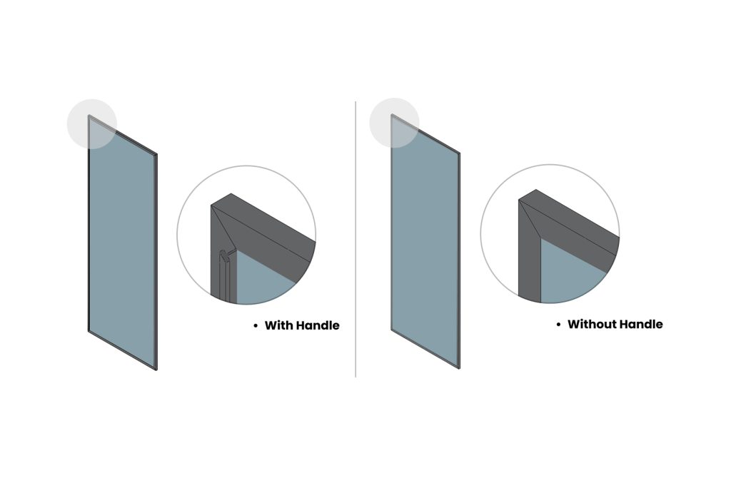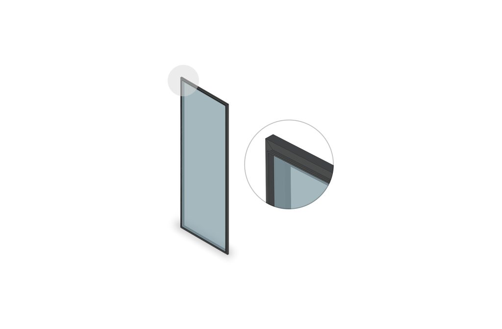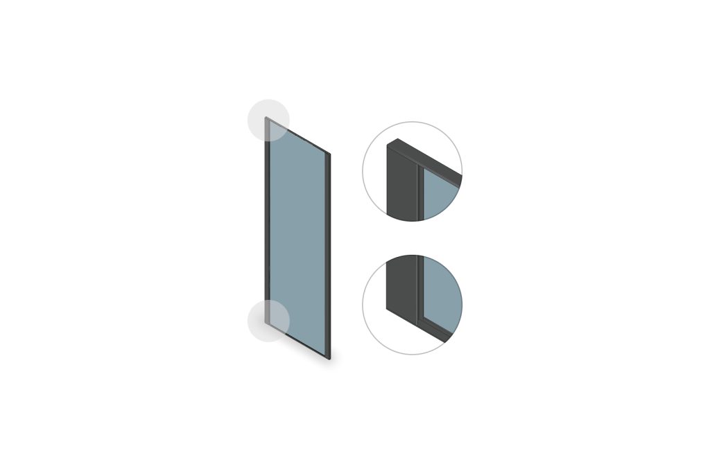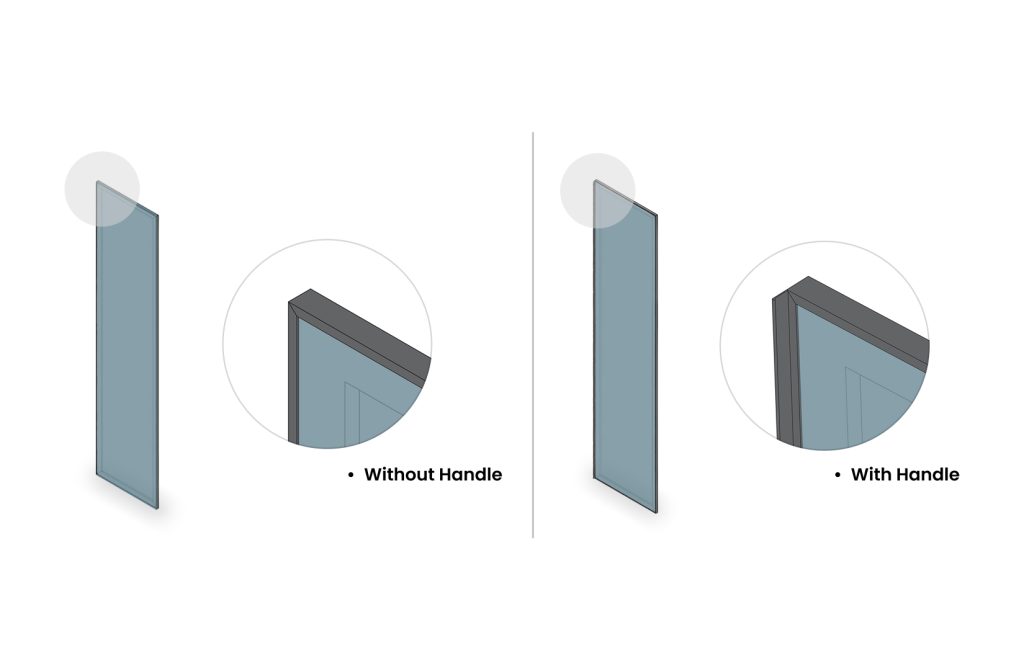A distinctive hinged glass shutter featuring a slim outer handle that runs along all four sides.