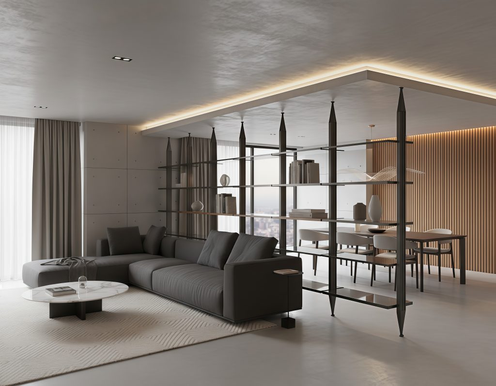 A refined open system with vertical aluminum profiles fixed floor-to-ceiling. The Elite System offers a sleek, architectural look with shelves and accessories — ideal for open wardrobes, interior partitions, or versatile storage solutions.